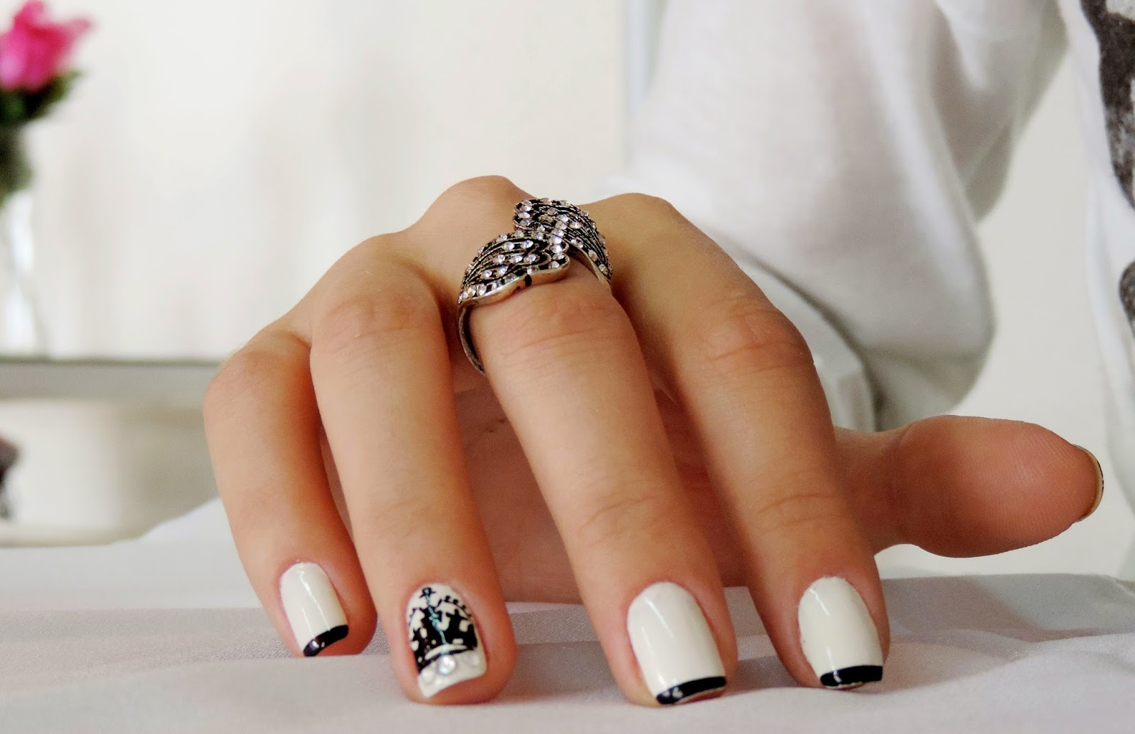 Sempre achei que unha branca ficava 'apagada' sabe? Ai vi suas fotos e fiquei ba-ban-do. Gente, como é que uma simples francesinha preta daria tanto destaque? E esse detalhe da coroa, LINDO! Super combinou com tudo! Tô até com vontade de pintar mais as unhas hahahaha