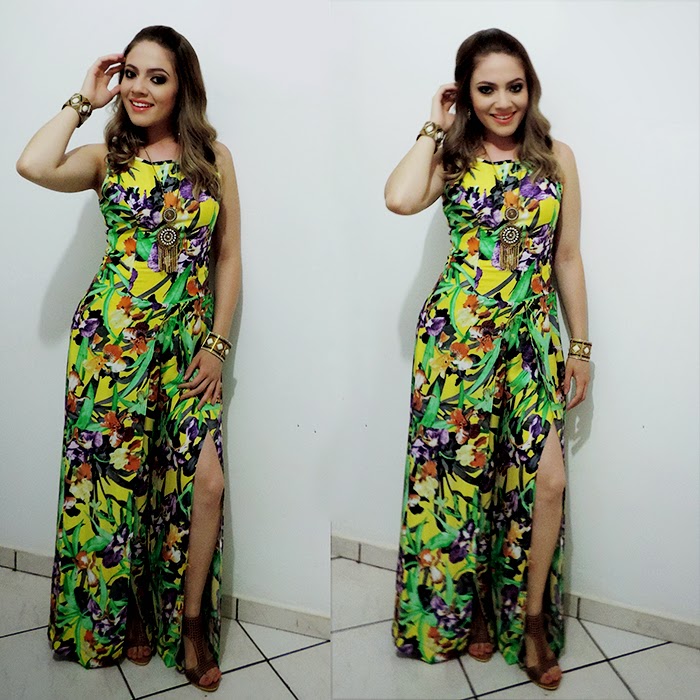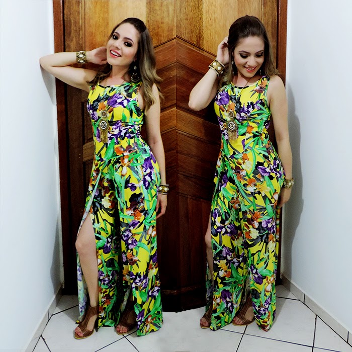 Bom, no terceiro dia, o traje era longo! Aí optei por um macacão maravilhoso, com um mix de cores fortes e estampa floral que caracterizaram o verão e ainda por cima deixou o look mega estiloso! Os longos são peças chave para alongar a mulher, além de deixá-la super elegante, com esse modelo pantalona, com fendas laterais, o resultado não poderia ser diferente!