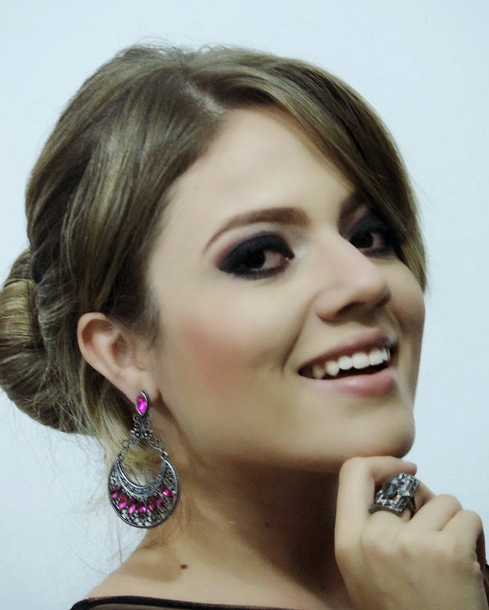 Começando pelo meu coque rosquinha! O modelo mais fácil e versátil de se prender o cabelo e ficar elegante! Mas como meu cabelo está bem repicado e com franja, quis fazer algo mais despojado, por isso deixei uma parte do meu cabelo (a parte mais curta) sem prender e só depois do coque pronto é que fui desfiando as mechas e prendendo de forma que ficasse bem fofinho em cima, a parte da franja deixei cair ao redor do rosto e o cabelo que sobrou do coque pedi pra minha mãe fazer várias trancinhas e contornar a base do coque. Minha mão foi meu braço direito durante todo o processo heim! hahaha
