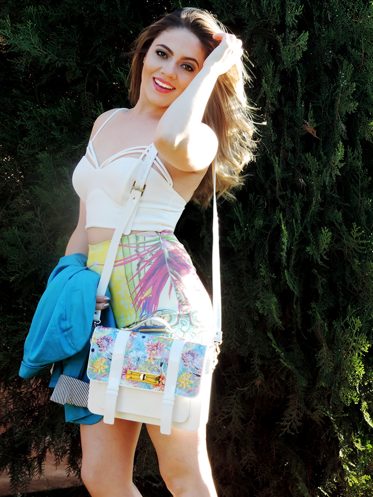 Os acessórios em dourado com pedraria colorida deu o maior UP na produção e esta bolsa da Petite Jolie azul destacou a estampa do shorts. Não ficou uma perfeição?