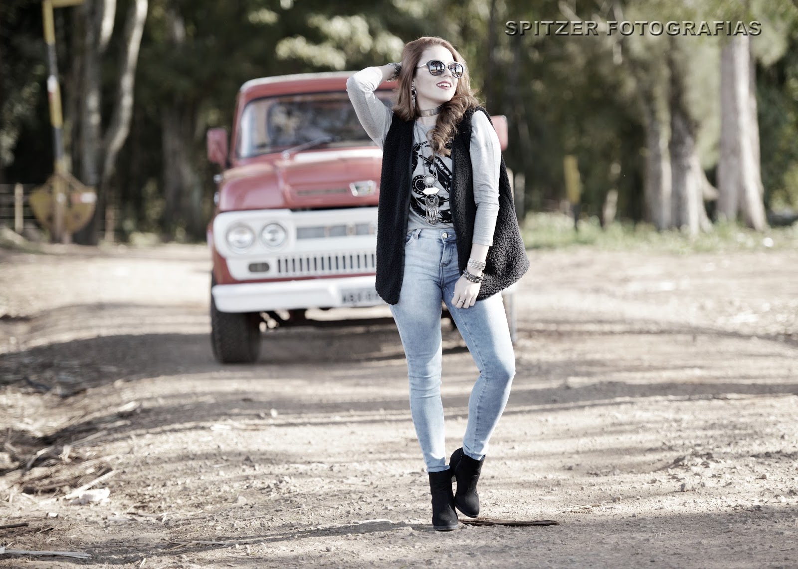 Eu quis montar um look bem cool, então me joguei no colete, t-shirt, jeans e botinha de cano curto. Eu adorei o resultado, uso looks assim sempre! É claro que os acessórios fazem toda a diferença, apostei na choker junto com um colar comprido e braceletes, óculos e um chapéu para fazer um charme!