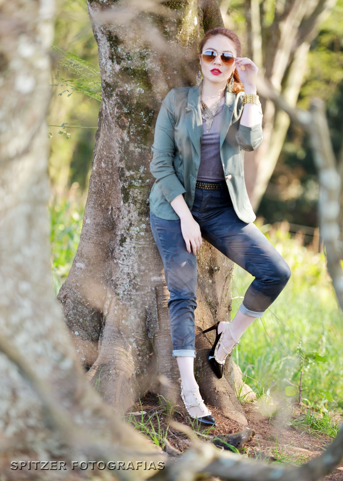 A combinação dessa peça com tons neutros, como o cinza e até mesmo o próprio verde militar, que gera um look monocromático ultra estiloso, é certeira! Apostar em acessórios bem marcantes e mais pesados é um dos segredos para deixar seu look incrível! Mas é claro que, diante a tantas características rústicas, um toque de muita feminilidade cai perfeitamente bem, como por exemplo o scarpin de salto alto! Acho incrível o resultado de looks assim, que combinam o "fino" com "grosseiro", um estilo Hi-Lo. Preferi usar a barra da calça virada, que além de alongar mais é uma trend que continua com tudo!
