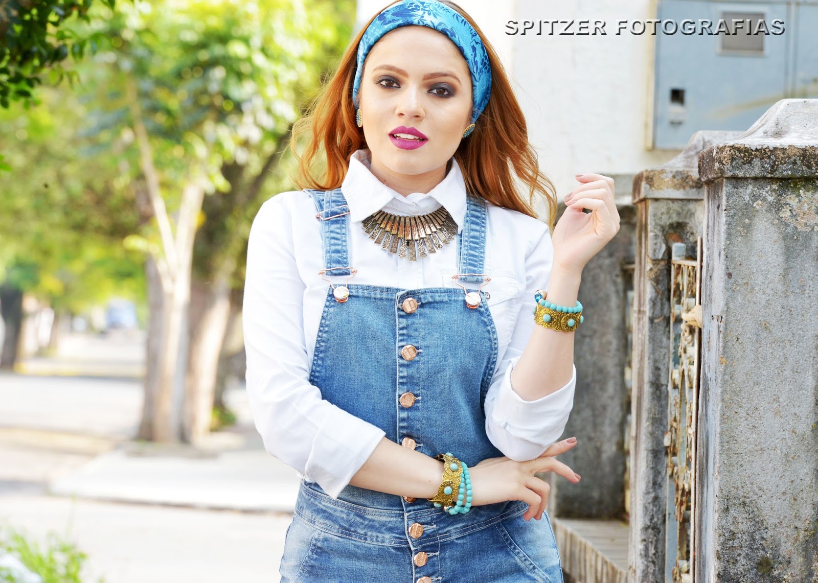 Dando continuidade às inspirações de looks, com a jardineira jeans, hoje trouxe um look mais casual, porém, com alguns detalhes que deram bastante estilo à composição. Optei por combinar a jardineira com uma camisa jeans, fechada até em cima, com um maxi colar fazendo sobreposição na gola.
