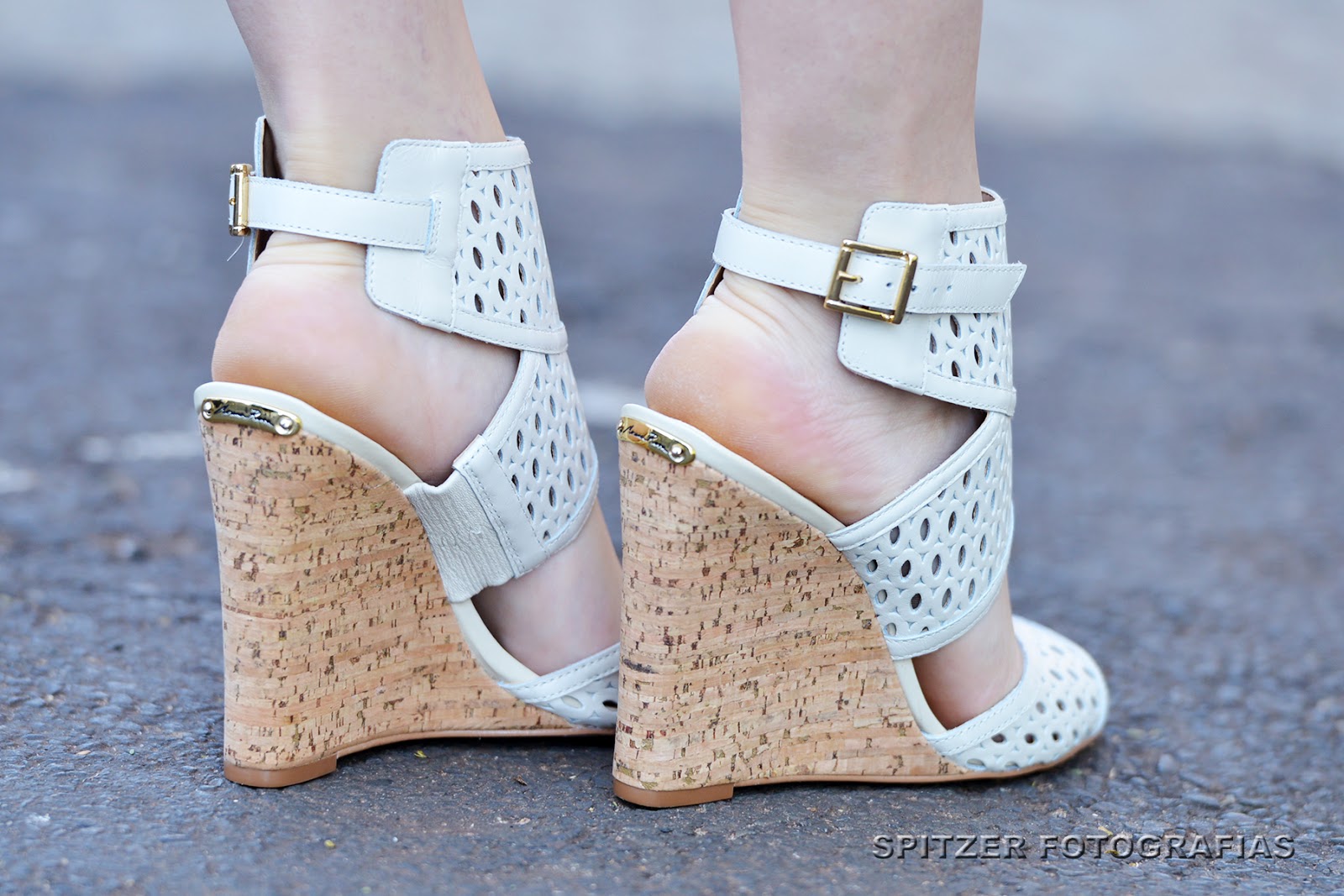 Então, como já está ficando de praxe, trouxe duas opções de calçados para vocês. A primeira, é esta anabela linda, com salto de cortiça e trançada com talas grossas, acho lindo esse efeito, quando a sandália sobe mais o tornozelo! Achei essa opção super apropriada para ocasiões durante o dia. Os tons claros estão com tudo neste verão e a combinação com o macaquinho ficou linda, não acham?
